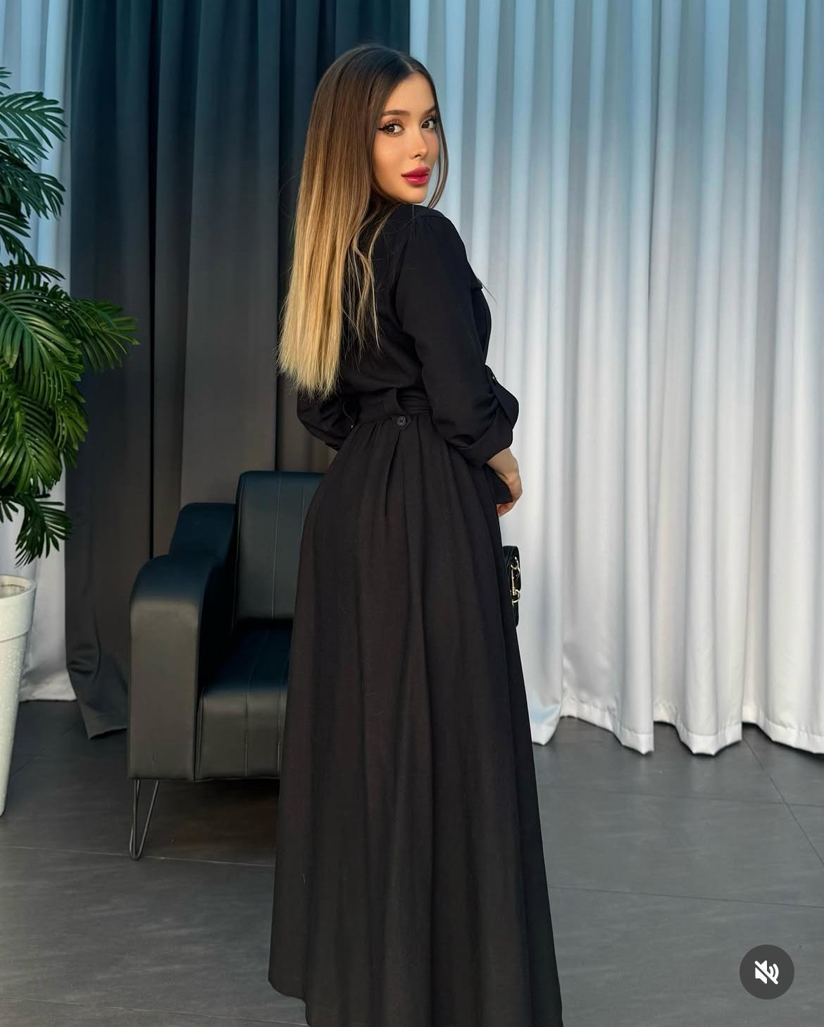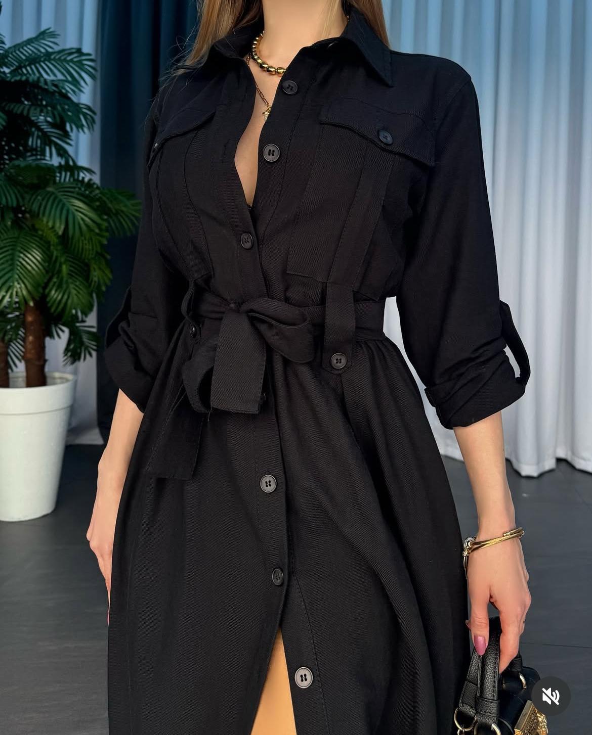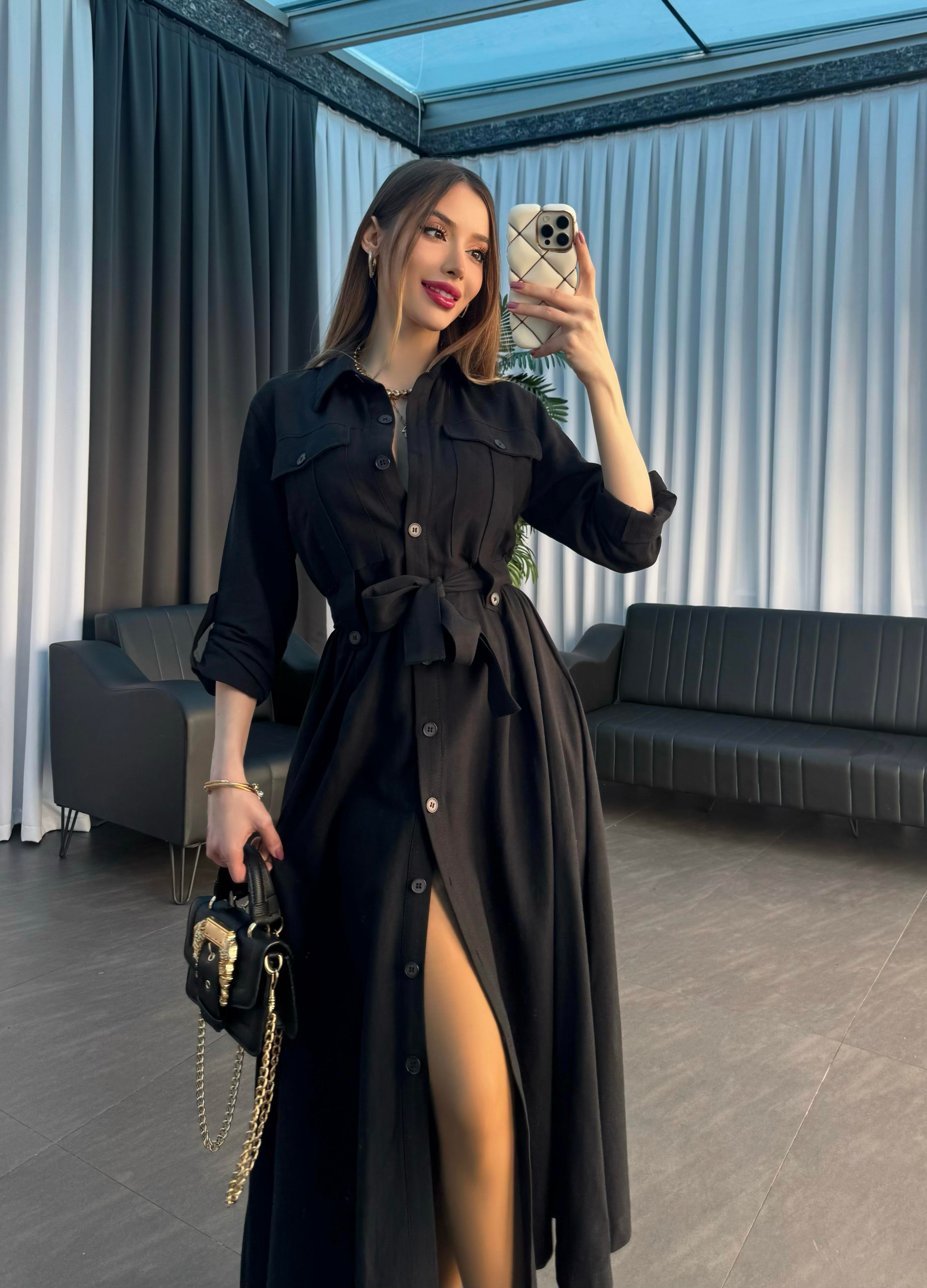 Gabardin Kumaş Düğme Ve Bağlama Detaylı Terra Elbise Siyah (1113)